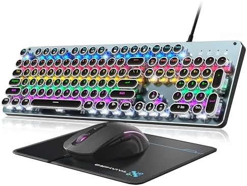 Typewriter Type Mechanical Gaming Keyboard Blue Change, Rainbow LED Backlit Wired Pc Keyboards Mouse and Pad Combo, Steel Panel Retro Punk Spherical Keycaps, 104 Keys Anti-Ghost for PC Laptop computer Gamer